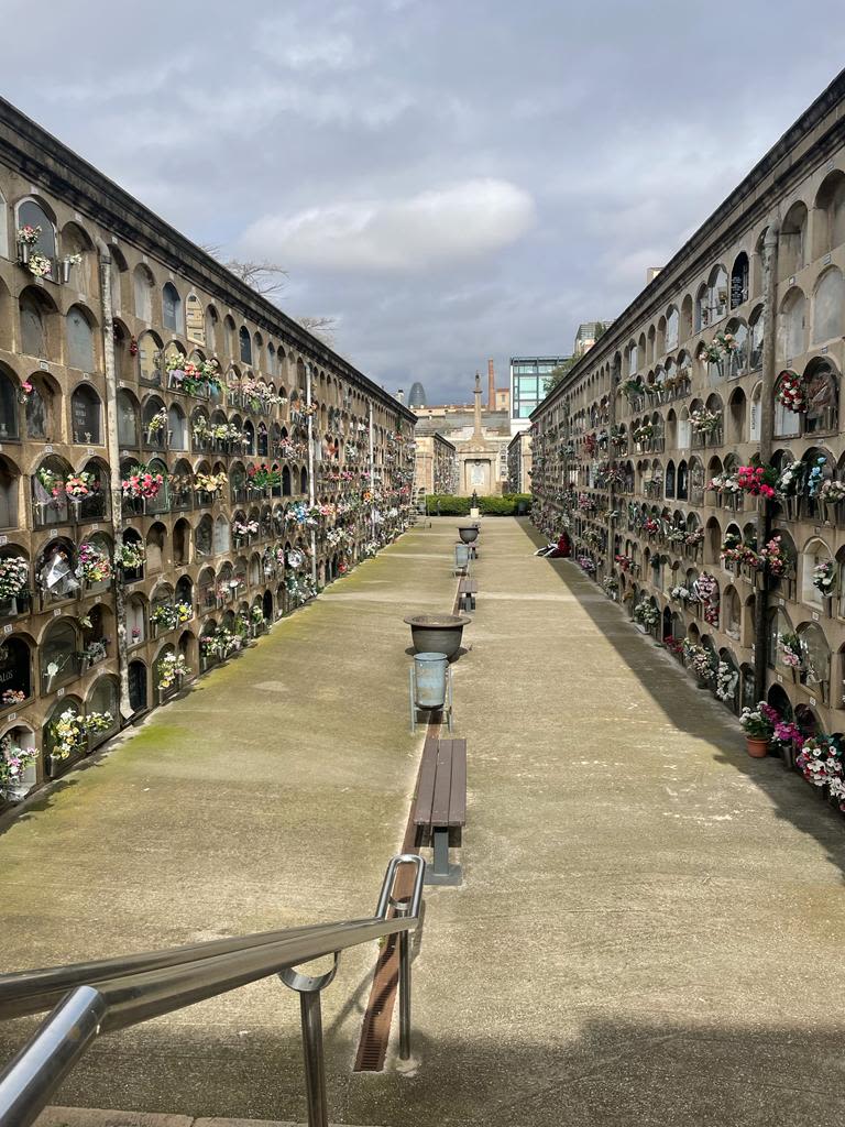 El cementerio refleja la sociedad. Como un calendario de Adviento a escala humana, las tumbas se distribuyen en filas y columnas, de manera simétrica y creando largos pasillos que parecen el laberinto de Horta. Esta organización imita el principio de igualdad de la Revolución Francesa. No obstante, el caminante observa, entre estas silenciosas paredes, grandes monumentos fúnebres de piedra que ocupan casi todo el camino. Algunos de ellos contienen inscripciones, otros no. Los últimos debieron ser desahuciados al no renovar el alquiler de la tumba, algo parecido a lo que sucede con los fondos buitre en el sector inmobiliario (!). En todo caso, la llegada de la fiebre amarilla, en el siglo XIX, provocó una multitud de fallecimientos que enterraron en medio de los pasillos por falta de espacio.